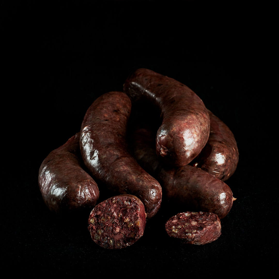 20% kasza gryczana, 25% podgardle wieprzowe, 28% mięso wieprzowe, 5% wątróbka wieprzowa, 20% suszona krew wieprzowa, sól, przyprawy, jelito wieprzowe.